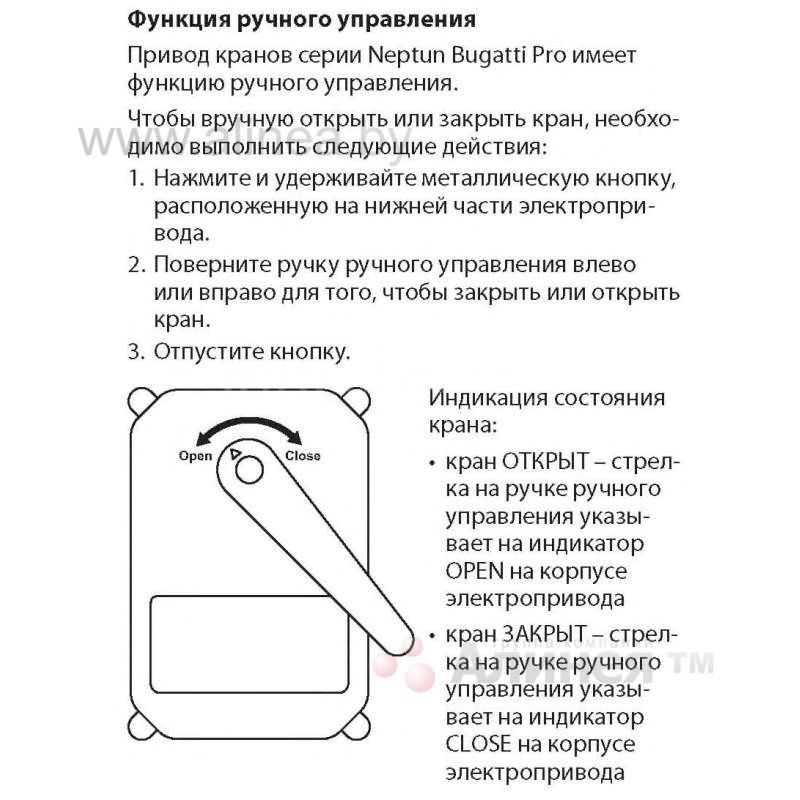 Предусмотрено ручное управление краном с помощью рычага на корпусе электропривода. Ручное управление возможно только при полностью обесточенном электроприводе и при нажатии металлической кнопки, расположенной в нижней части привода. В противном случае может быть поврежден внутренний механизм привода!