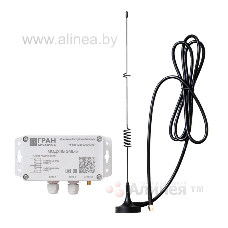 Модуль SML-5 с внешней антенной предназначен для подсчета количества импульсов, приходящих на два независимых входа, с заданным коэффициентом и последующим накоплением и передачей данных в сеть LORA (LoRaWAN) на сервер Водоканала или другой снабжающей организации.